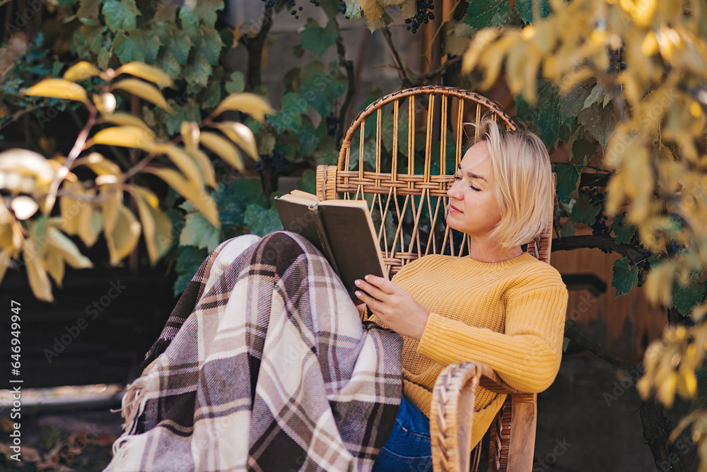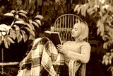Beautiful girl resting sitting in autumn garden in chair wrapped in a woolen plaid blanket. Girl reading a book