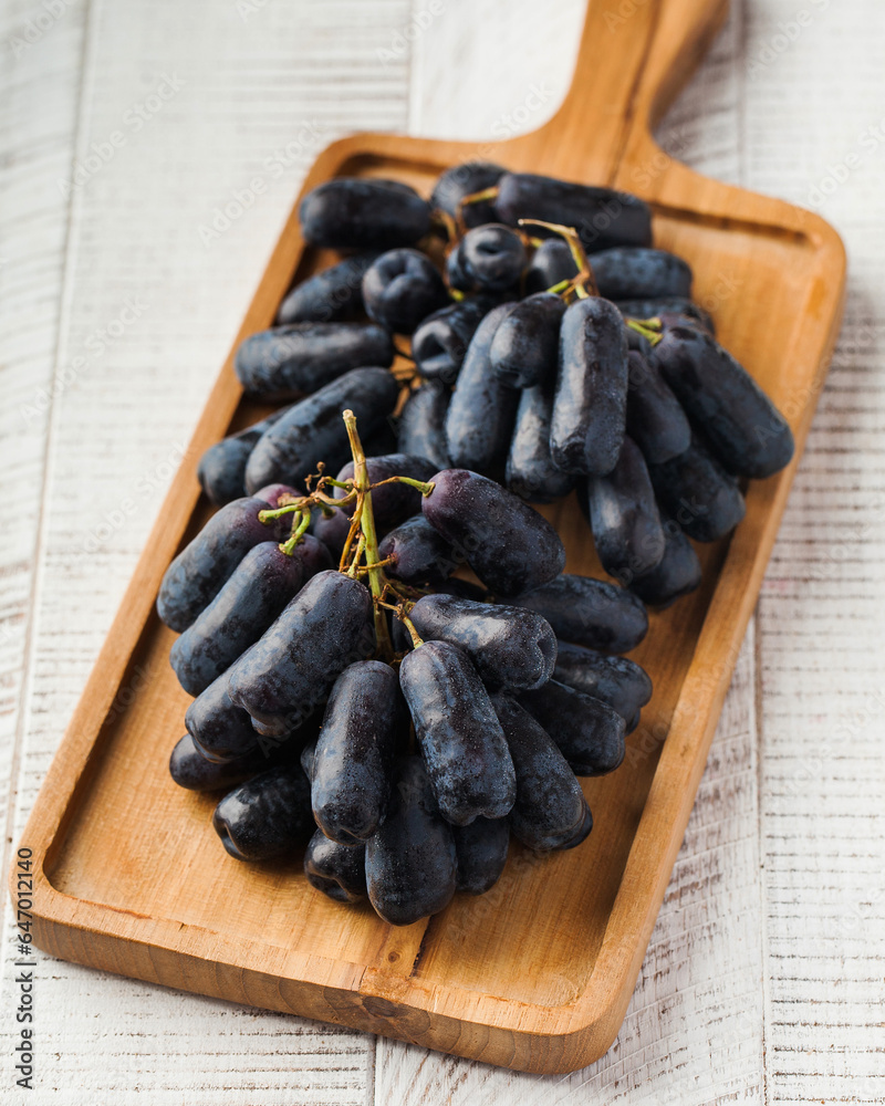 Dark ripe grapes on a board on a light wooden background. Fruit