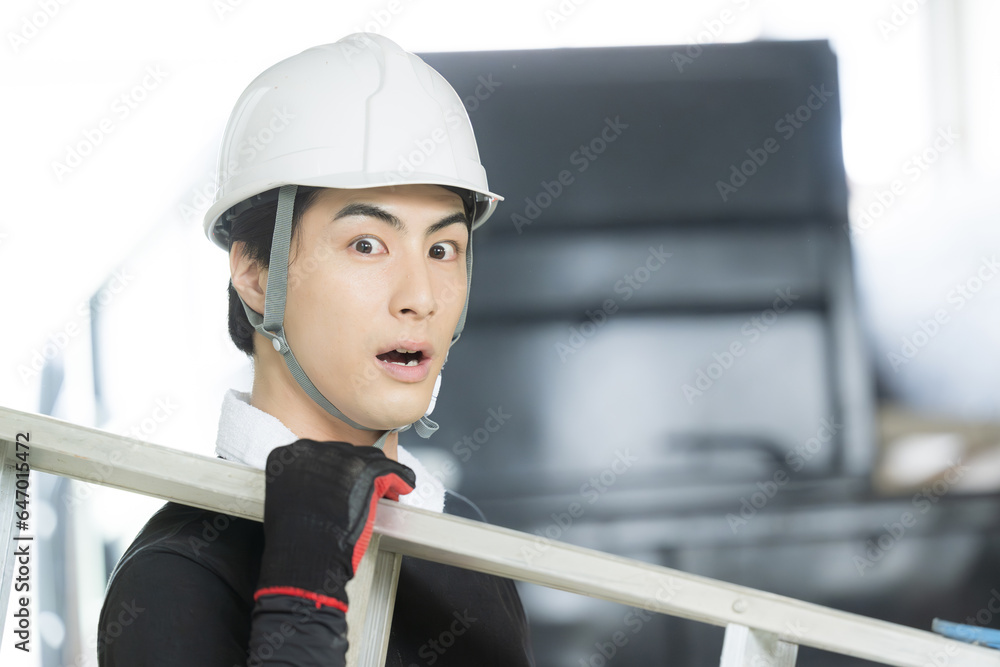 現場確認をするヘルメットをかぶった若い作業員驚いた表情の男性 ビックリ!今日もご安全に