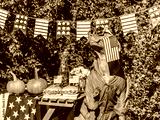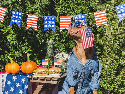 Cute dog, American Flag, two delicious hamburgers, pumpkins and homemade lemonade. Close-up, outdoors. Day light. Pets care concept. Congratulations for family, relatives, friends and colleagues