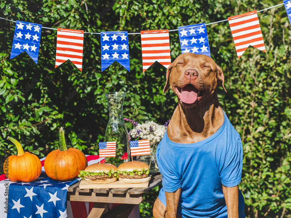 Cute dog, American Flag, two delicious hamburgers and homemade lemonade. Care pets. Close-up, outdoors. Day light. Delicious food concept