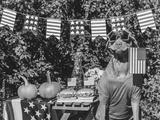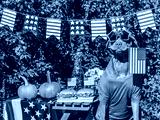Cute dog, American Flag, two delicious hamburgers, pumpkins and homemade lemonade. Close-up, outdoors. Day light. Pets care concept. Congratulations for family, relatives, friends and colleagues