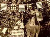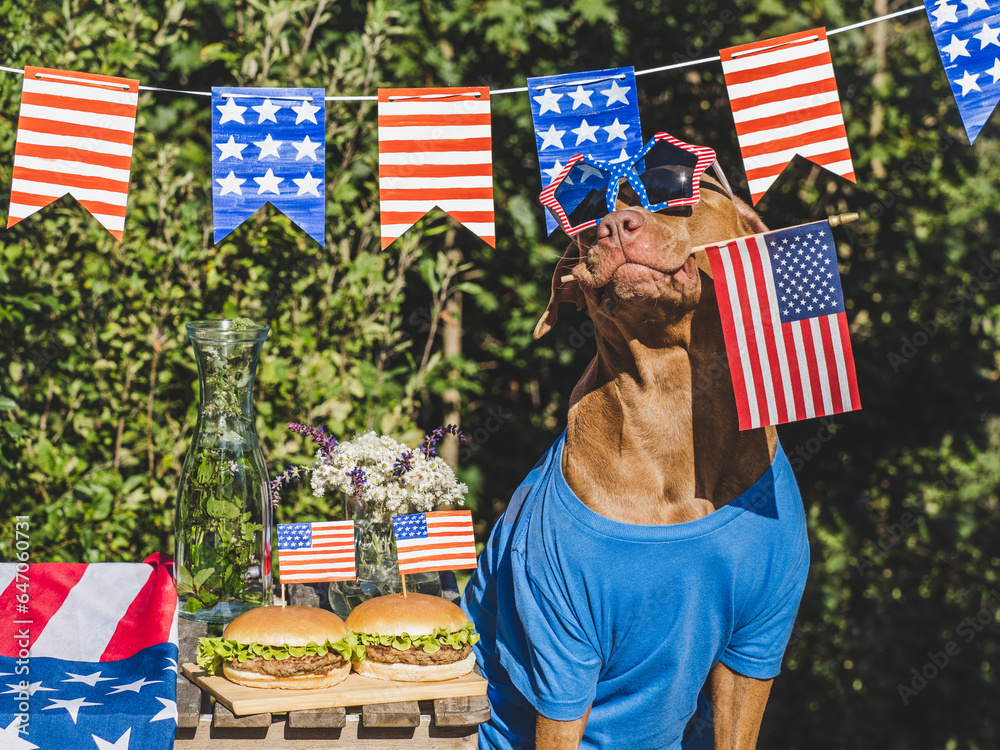 Cute dog, American Flag, two delicious hamburgers and homemade lemonade. Close-up, outdoors. Day light. Pets care concept. Congratulations for family, relatives, friends and colleagues