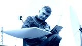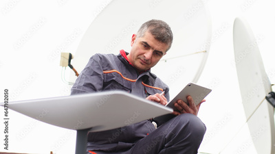 A man installs a satellite dish for fast Internet.