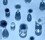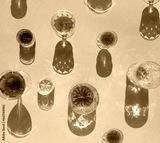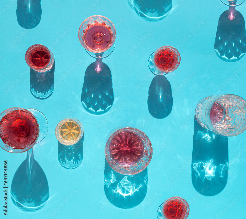 Creative pattern of glasses with red wine, cocktail and champagne on a sunny day. Party concept on blue background. Flat lay.