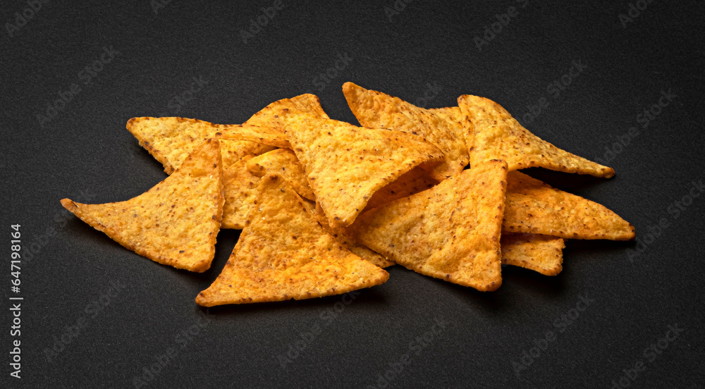 Corn chips, hot Mexican nachos isolated on black background
