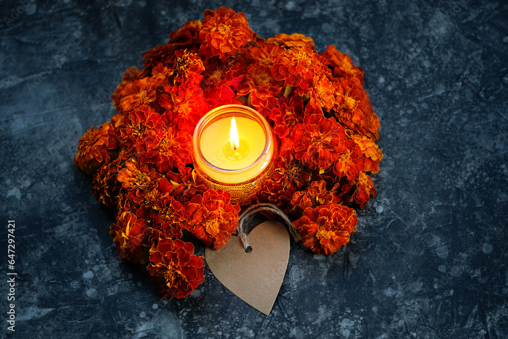 burning candle, marigold flowers and heart card on abstract dark background. cempasuchil flowers - symbol of Mexico's Day of the Dead. dia de los Muertos holiday concept. esoteric spiritual ritual