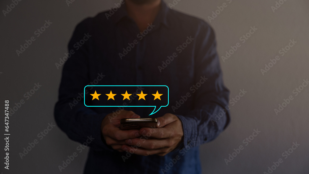 Customer pressing satisfaction with gold five star rating feedback icon and press level excellent rank for giving best score point to review the service , experience success business rate concept.