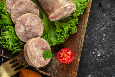 meat in jelly pork, beef meat on a wooden board. place for text, top view
