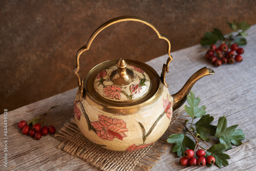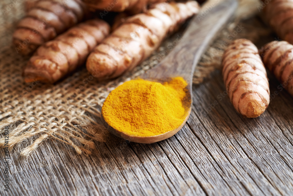 Curcuma powder with fresh turmeric root with copy space