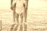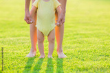 Young adult mother holding hands and helping baby boy in bodysuit taking first steps with barefoot on fresh green grass at park. Spending time together in beautiful warm sunny summer day. Front view.
