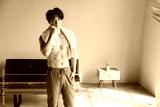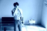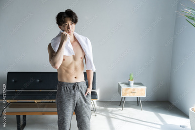 体を鍛えるハンサムな男性の正面 トレーニングやフィットネスのイメージのカメラ目線