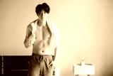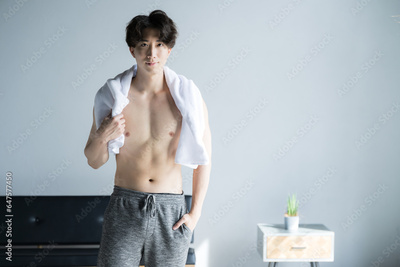 体を鍛えるハンサムな男性の正面 トレーニングやフィットネスのイメージのカメラ目線