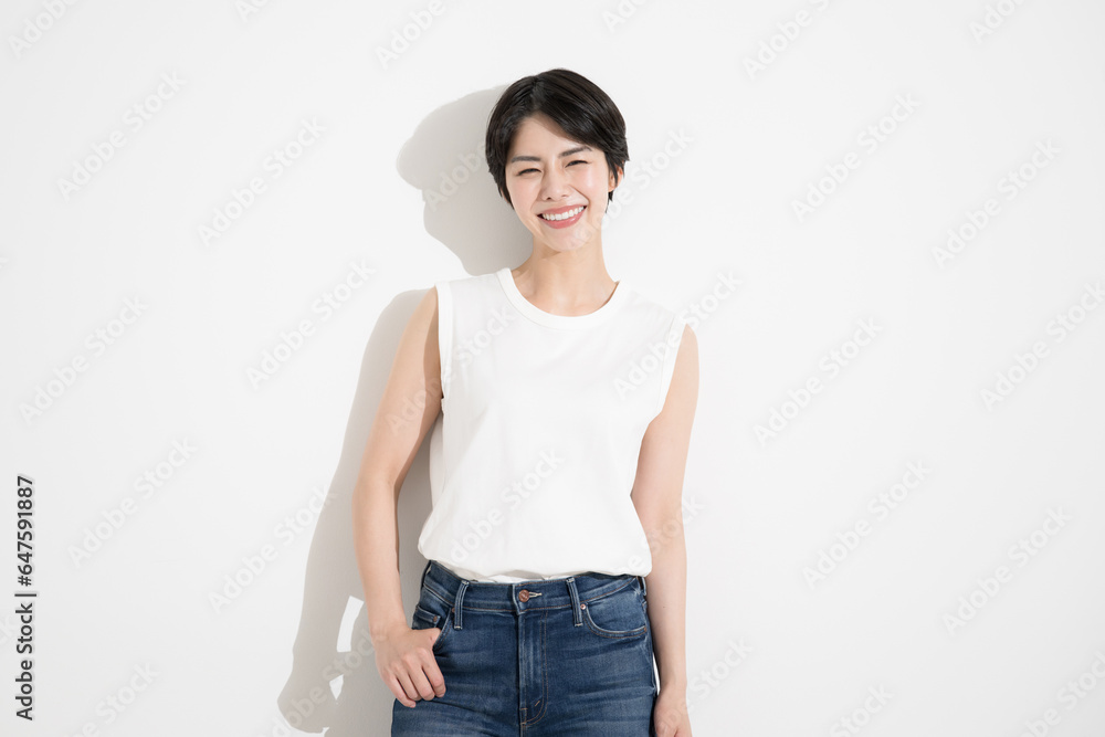 デニムを履いた笑顔の女性 カメラ目線の笑顔