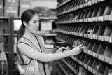 factory worker using laser barcode scanner and looking spare parts storage cabinet