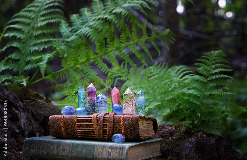 old witch spell books and quartz minerals in forest, natural background. Gemstones for Magic Crystal Ritual. Witchcraft, spiritual esoteric practice. healing stone therapy for harmony, meditation