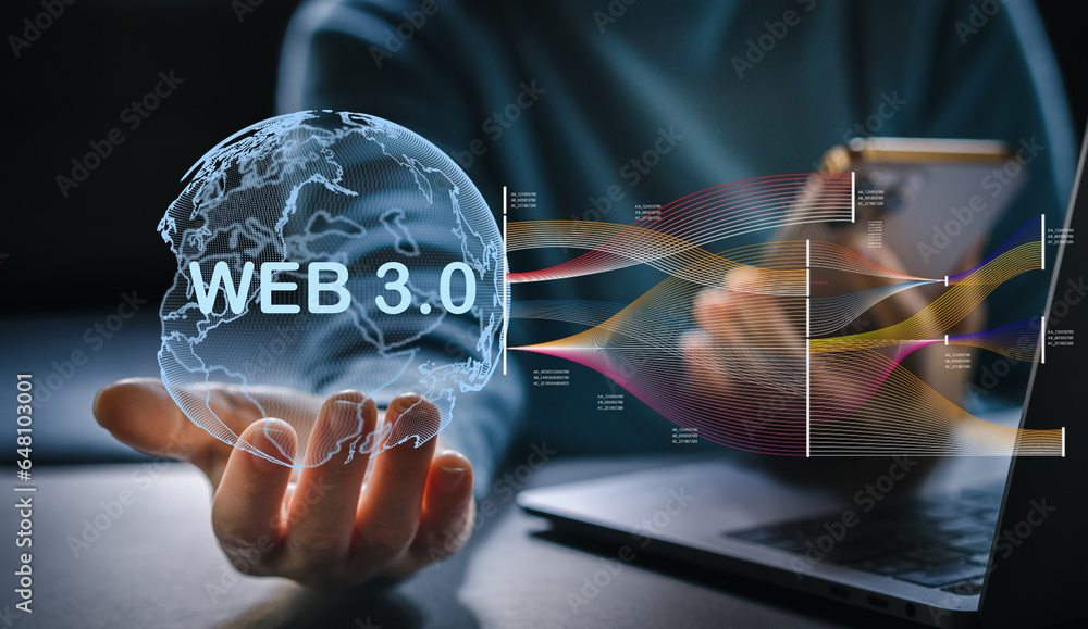 Human hold Web 3.0 with globe, big Data and blockchain concept, Technology development network, blockchain technology, global futuristic, website internet, business and WEB 3.0 concept