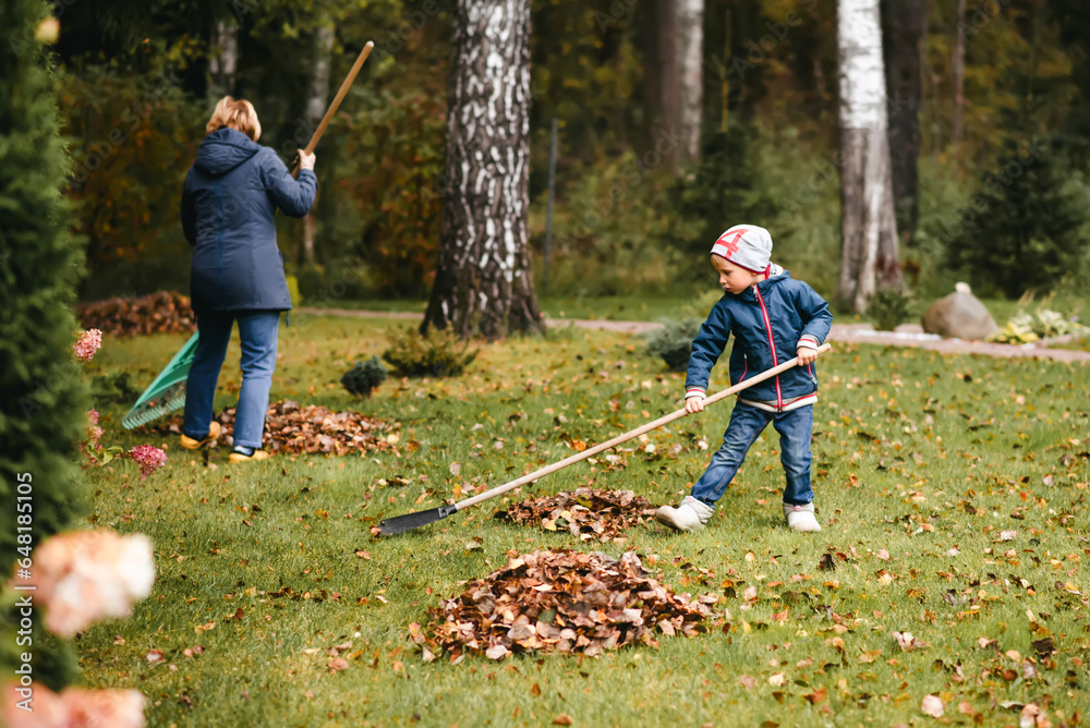 A little boy helps his grandmother in the garden, raking fallen dry leaves.