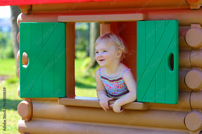 Little girl having fun outdoors hiding in plastic playhouse