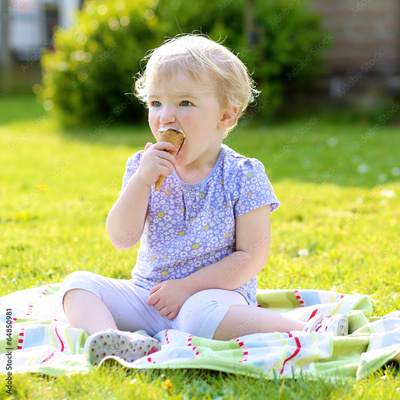 Cute toddler girl eating ice cream sitting in the garden