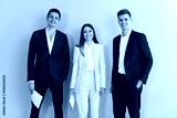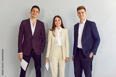 Team of happy young business people standing in the office. Group of two men and one woman wearing elegant, smart, formal dress code blue, purple and beige suits posing by a light grey wall