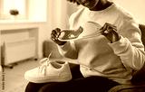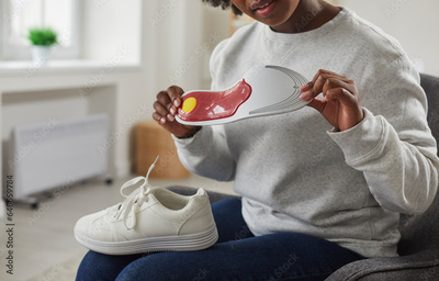 Cropped shot of young African American woman with shoe on her lap sitting on chair at home and looking at orthotic arch support insole that she is holding in her hands. Footwear, feet health concept