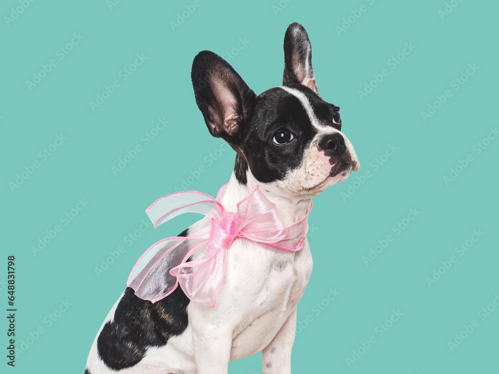 Cute puppy and pink bow on his neck. Studio shot. Isolated background. Close-up, indoors. Day light. Concept of care, education, obedience training and raising pets