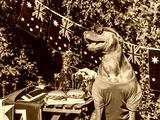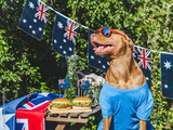 Cute dog, Australian Flag, two delicious hamburgers and homemade lemonade. Close-up, outdoors. Day light. Pets care concept. Congratulations for family, relatives, friends and colleagues