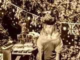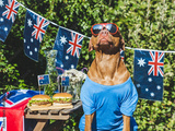 Cute dog, Australian Flag, two delicious hamburgers and homemade lemonade. Close-up, outdoors. Day light. Pets care concept. Congratulations for family, relatives, friends and colleagues