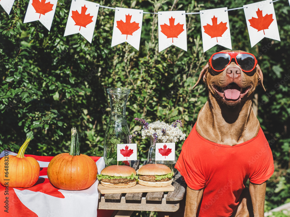 Cute dog, Canadian Flag, two delicious hamburgers, pumpkins and homemade lemonade. Close-up, outdoors. Day light. Pets care concept. Congratulations for family, relatives, friends and colleagues