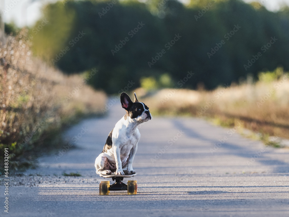 Cute puppy riding a skateboard. Clear, sun day. Close-up, outdoor. Day light. Concept of care, education, obedience training and raising pets