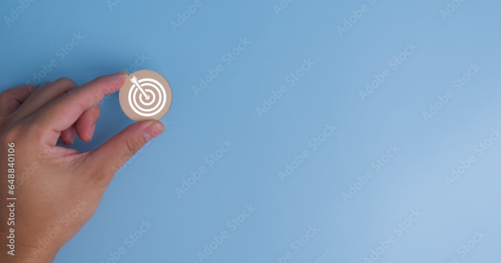 Hand holding paper cut with target icon. concept vision leadership investment business strategy, Action plan, Goal and target. copy space