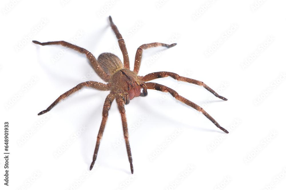 Closeup of the infamous Brazilian wandering or banana spider Phoneutria nigriventer (Araneae: Ctenidae), a medically important spider photographed on white background.