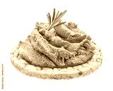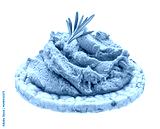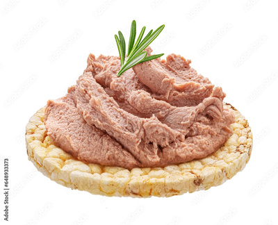 Liver pate on puffed rice cake isolated on white background, full depth of field