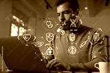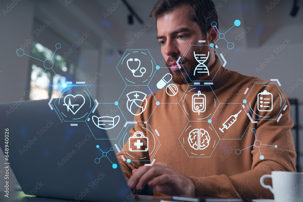 Thoughtful businessman in casual wear typing on laptop at office workplace. Concept of insurance company, help, business, internet surfing, information technology. Medical icons hologram