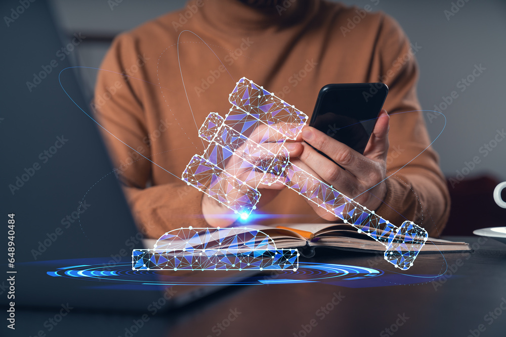 Man read, send text message from phone. Holding using smartphone typing at office workplace with notebook. Concept of distant work, business education. Legal and law icons