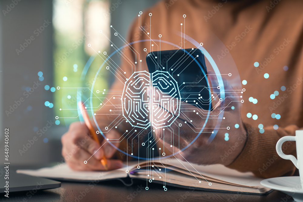 Man text read send message by phone. Holding using smartphone typing at office workplace with notebook. Concept of distant work, business education. Technology Ai and robotics
