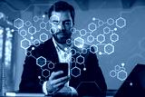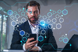 Smiling businessman talking holding using smartphone typing at office workplace with notebook. Concept of distant work, business education. Blockchain crypto hologram