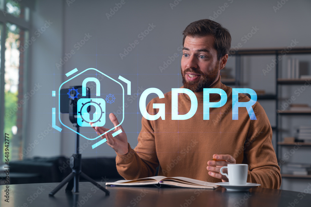Happy man is making video blog using smartphone on a tripod explaining, teaching, master class people in room. Concept of online stream, business education, conference call. Data protection