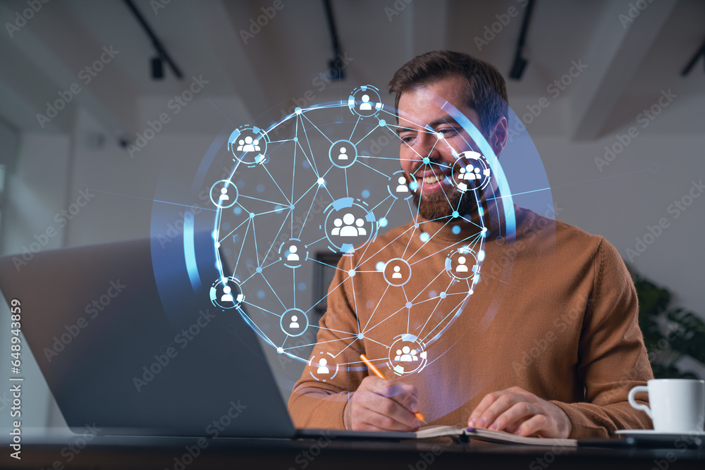 Thoughtful businessman in casual wear typing on laptop at office workplace. Concept of distant work, business, internet surfing, information technology. Social network hologram