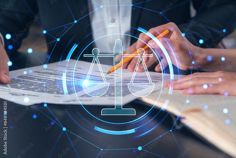 Businesspeople in formal wear taking notes signing contract at office workplace. Concept of important working moments, document sign, working process, concentration. Hands shot. Legal theme hologram