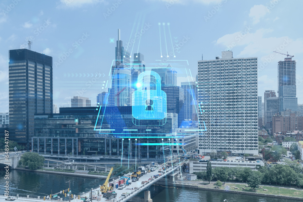 Aerial panorama city view of Philadelphia financial downtown at day time, Pennsylvania, USA. Glowing Padlock hologram. The concept of cyber security to protect companies confidential information