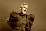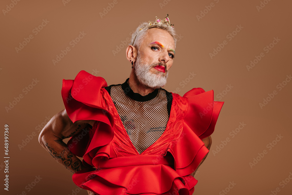 Portrait of confident mature gay man in beautiful red dress looking at camera against brown background