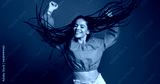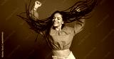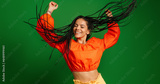 Attractive young woman with dreadlocs dancing and looking happy against green background