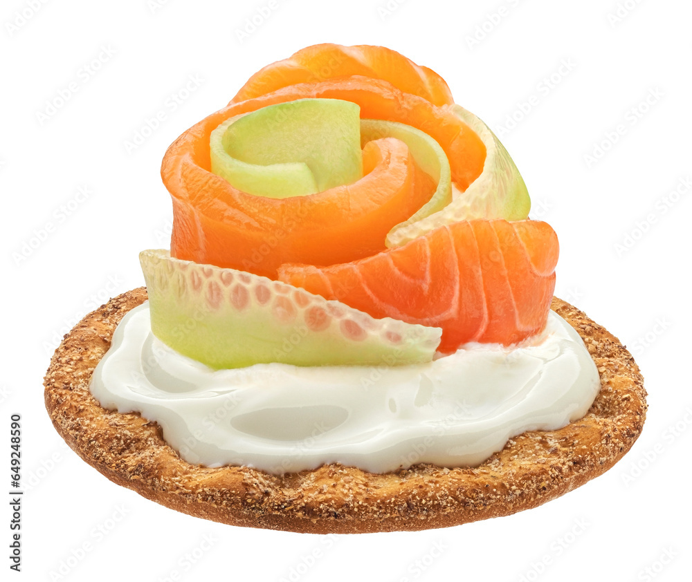 Smoked salmon with cream cheese on cracker isolated on white background