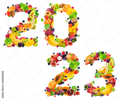 2023 year number made of fruits and berries isolated on white background