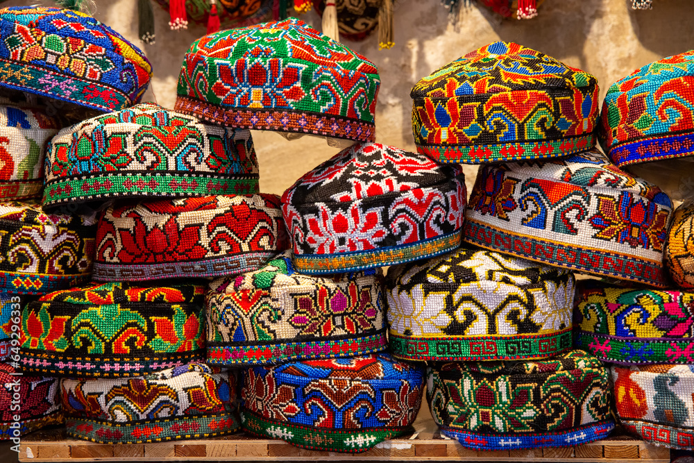 Uzbek skullcap. A traditional headdress in Uzbekistan is a skullcap. Multicolored patterns on the skullcaps