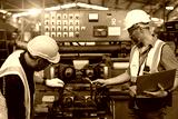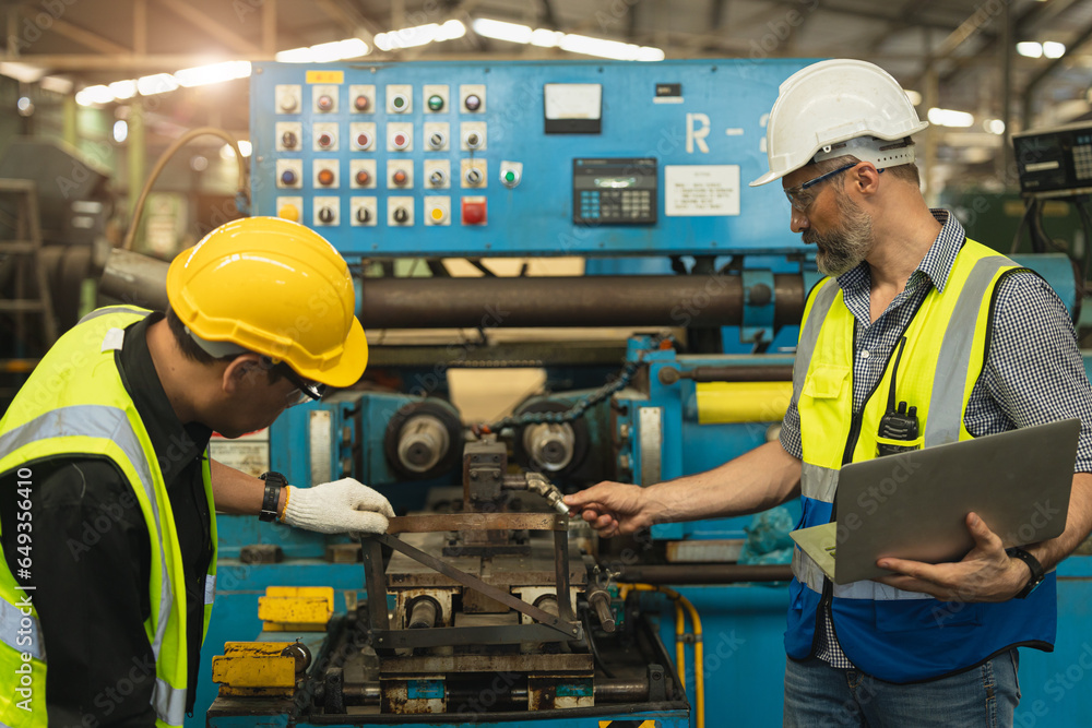 Engineer technician teamwork consulting problem together service maintenance old machine for safety in heavy industry factory