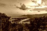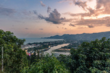 Panorama of town, tropical coastline, dense rain forest from high hill at sunset, Koh Samui, Thailand