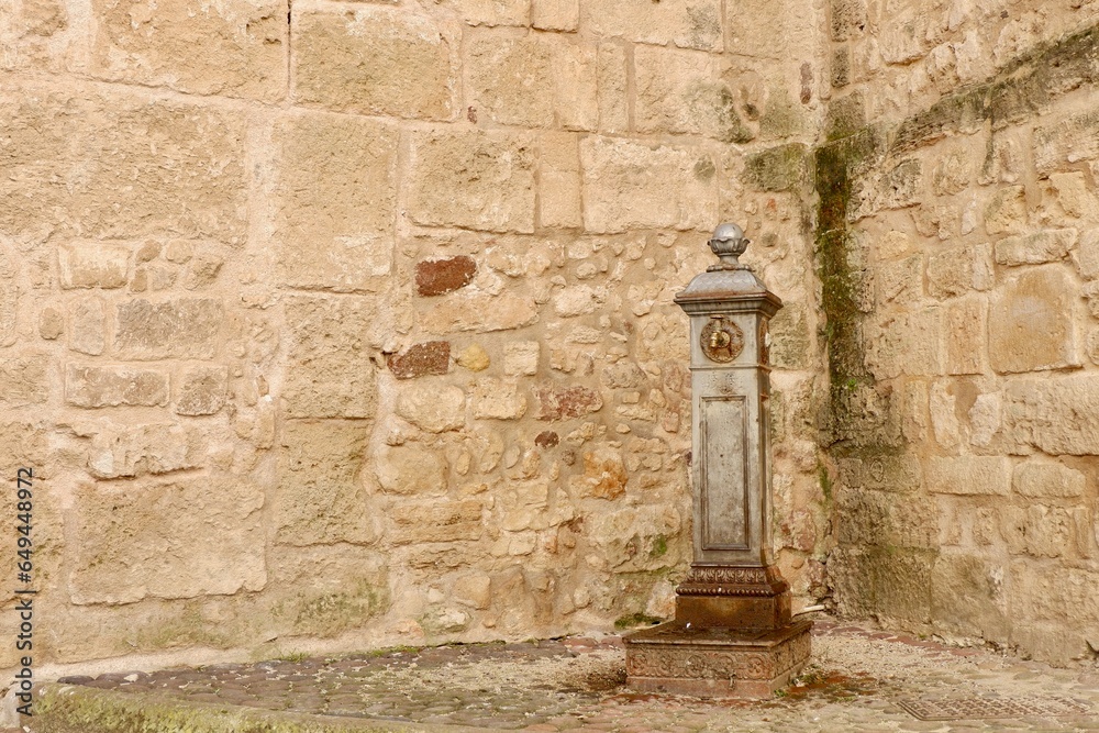 Italian style fountain in the corner on street against old antique stone wall of Alghero, Sardinia, Italy. Weathered damaged drinking faucet. Vintage Italian architecture